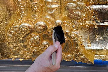 Dennis is using a super-soft brush to burnish the gold leaf down to stick onto the sizing.