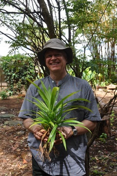 His task: to plant this edible pandanus. Pandanus amaryllifolius is is known commonly as dal pandan and used widely in Southeast Asian cooking. They have a nutty, botanical fragrance which enhances the flavor of Indonesian, Filipino, Malaysian, Thai, Vietnamese and Burmese foods, especially rice dishes and cakes. The leaves are sometimes steeped in coconut milk, which is then added to the dish. They may be tied in a bunch and cooked with the food. They also may be woven into a basket which is used as a pot for cooking rice.