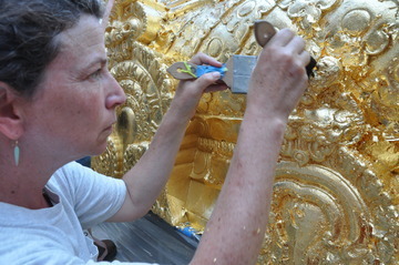Jill is the best of the guilders, and a teacher in the bargain. Jill is working with two brushes at the same time since the wind came up suddenly and the leaf was being lost. They hate to lose gold leaf, and carefully recycle all they can capture.