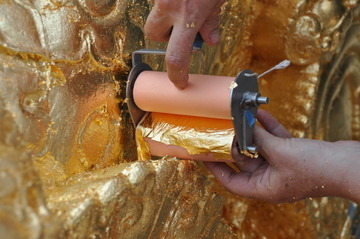 Michael Kramer invented this roller applicator and had it made to his specifications, to make application on larger surfaces more efficient. Check out our slideshow showing more of the gilding process along with Gurudeva's teachings on the Golden Body of the soul.