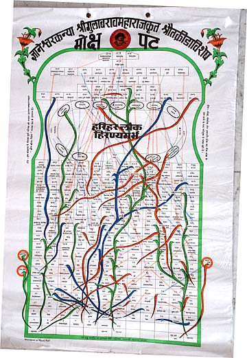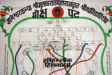 It is a complete map of various states of consciousness, character traits, lokas, behaviors etc. We roll the dice and depending on the square we land on, we proceed toward Moksha or slide back down to the bhuloka.