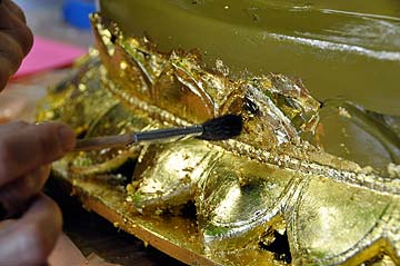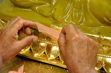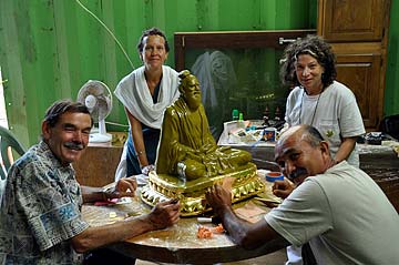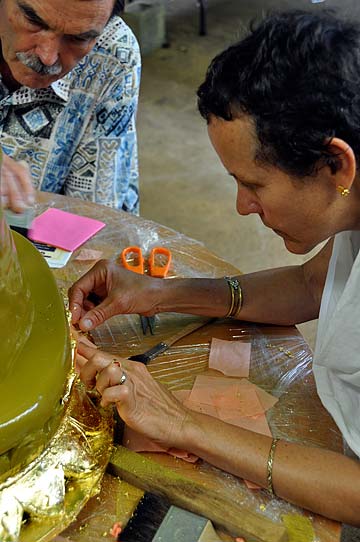 Jill London (right) from Gilder's Studio guides three of our shishya in the re-gilding of Gurudeva's murthi.