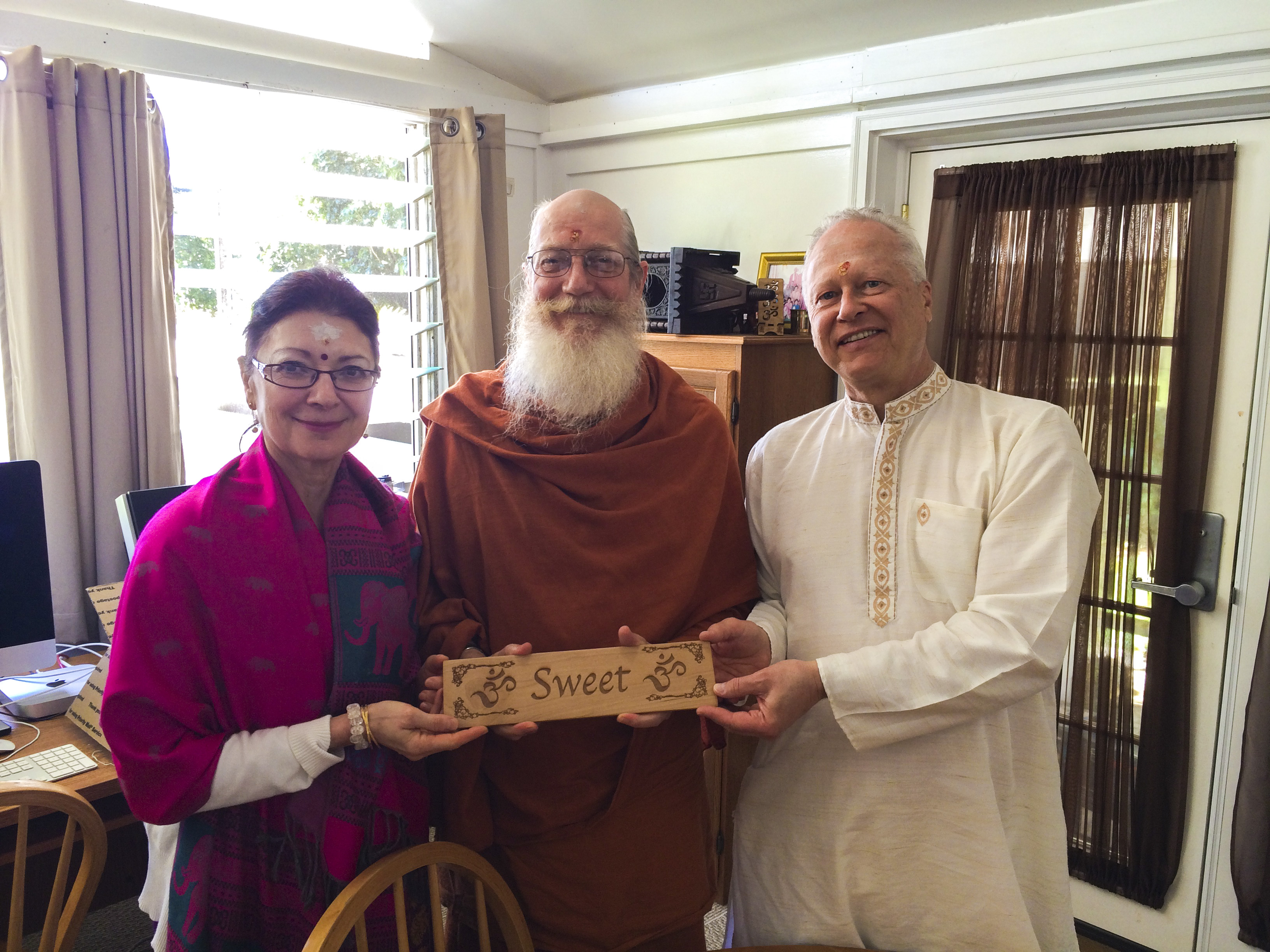 March 13, 2014SSC sishyas Aran & Tara Veylan are visiting Kauai from Edmonton, Canada. Aran & Tara are volunteers who ship orders for our Mini Mela Canada eStore at www.minimela.com/canada. Tara also helps with the Mini Mela Gift Shop at the Maha Ganapathy Temple in Edmonton. They recently purchased a vacation home near the monastery, and Sannyasin Shanmuganathaswami is presenting them with an Aum Sweet Aum for their new home.