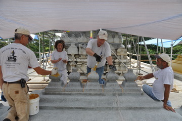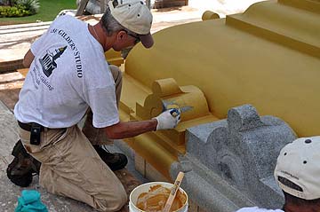 Here the team from Maryland begins the priming of the North tower. Once it dries, they will apply the sizing and the 23-karat gold. Did you know that gold is so thin that 200,000 sheets would only be an inch thick? You can see our slideshow on the priming below.