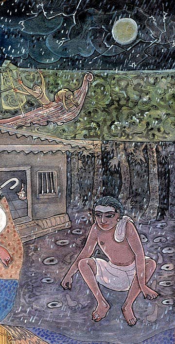 About two hours later, the wife, who was still waiting up for her husbandís return, noticed that the swami was holding a stout pole and sitting on the ground digging in the dirt beside him as if he were trying to push himself along with this makeshift oar. Yes, she thought, it looks as if he is pretending to row a boat, sitting in the dirt in the dark. She went out in the torrential rain and pleaded with Kadaitswami to stop, afraid of the weird goings on in here garden as much as what her husband would say when he came home to find the yard dug up. But Kadaitswami would not desist; in fact, amid the intensity of the storm and his work he seemed not even to hear her.