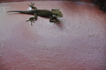 A small gecko. We have not been introduced, so he was really trying to be discreet and blend with the color of the brown pot.