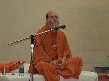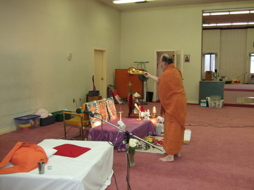 Bodhinatha performs an arati, then gives his talk.