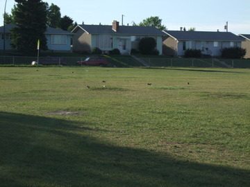 The small brown specks on the green grass are little squirrels. This soccer field was filled with them. They were running and playing in the morning hours.