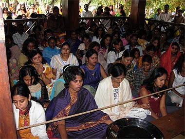 The rain has ceased a little allowing those devotees outside the tent to bring their trays full of offerings.