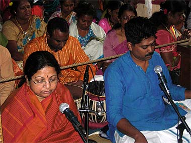 A special guest to the Park from South India, Mrs Premila Gurumurthi (left) from Madras University, Chennai is leading a song inside the Ganesha Mandapam.