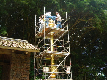 June 26, 2009The professional gilding group at work with Deva Rajan atop the Kodimaram of the Kadavul Temple.