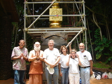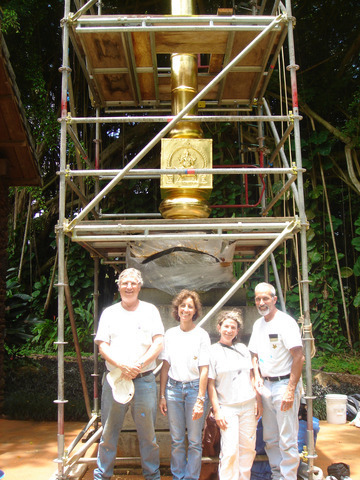 Gilder's Studio team pose for a final photo. Left to right: Michael Kramer, Lisa DaSilva, Jill London, Dennis DaSilva. Today was their last day having completed all of the gilding of the Capstone, Chinna Gopurams and Raja Gopurams of the Iraivan Temple.