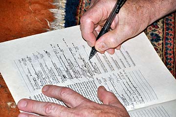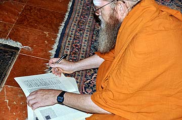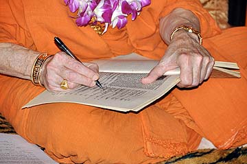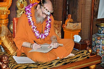 Later, dressed in new robes, Acharya Arumugaswami sat at Bodhinatha's feet in the Guru Peedam, signed his vow books acknowledge the initiation and recited from Gurudeva's instructions to his acharyas in the Nandinatha Sutras.