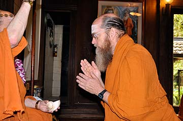 Swami received a private abhishekam on the banks of the Wailua River, where Bodhinatha and the three acharyas each poured a kumbha of river water over swami to betoken his entrance into acharyahood.