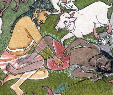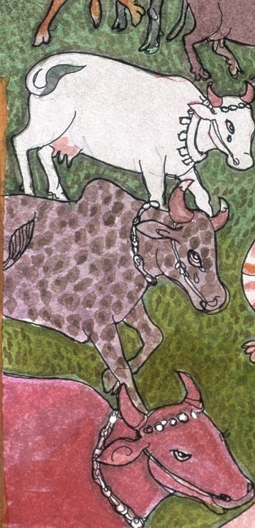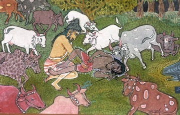 Walking one day on the banks of the Kaveri, he came upon a herd of cows bellowing in distress, mourning the death of their cowherd, whose body lay lifeless nearby. Sundaranatha's compassion proved overwhelming as he felt the pain of these berieved creatures. His soul reached out to assuage their distress. Rishi Sundaranatha wanted to bring solace to the cows. Being a great adept of siddha yoga, an accomplished raja yogi, he conceived a strategy to assume the herder's body. He first looked for a place to hide his physical body and found a hollow log. Then crawling into the log, where his body would be safe, he entered a mesmeristic, cataleptic trance, stepped out in his astral body, walked over to the dead cowherd, whose name was Mular, lay down on top of the corpse, entered it and slowly brought it back to life. The first thing he saw upon reanimating Mular's body was one of the most favored and intelligent cows, crying big tears from both eyes. These were tears of joy. All the cows now gathered round their beloved Mular, licking his face and body with their abrasive tongues and bellowing in bovine joy. After a time, being satisfied their cowherd was alive, they began to graze as usual, and the sight gladdened the heart of our Rishi. As evening fell, the cattle began walking back to the village, leading a newly embodied Mular behind them. Mular's wife was waiting at the village gate for her husband, who was late. The woman was alone, with neither children nor relatives. She felt a strangeness in her husband and began to weep. Sundaranatha told her he had no connection with her whatsoever, and instead of entering the home, he went back to a monastery that he had passed on the way. Mular's wife informed the villagers of her husband's strange behavior, soliciting their aid. They approached the monastery, speaking with her supposed husband, whose deep knowledge and presence baffled them.