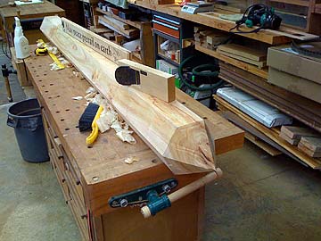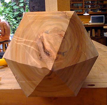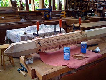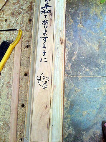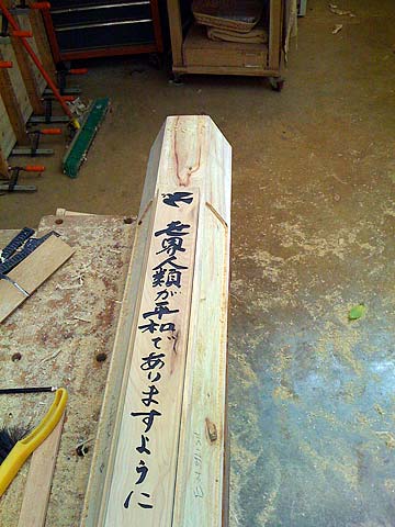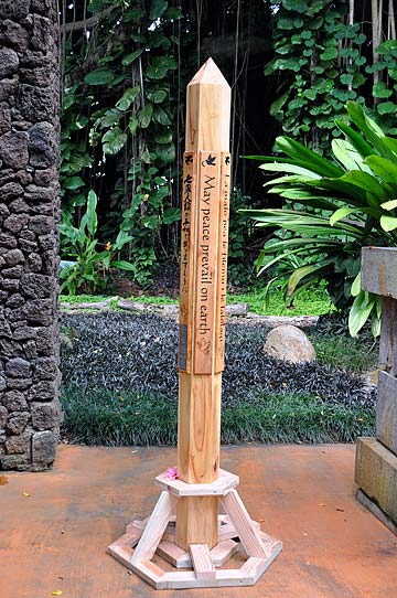 Work continued on the Peace Pole over the past retreat, scheduled to be delivered tomorrrow to the Hanapepe Matsunaga Peace Garden. After the hexagonal pole was roughed in with the chain saw and power planer, next it was finished off with Japanese planes. One of the placques is placed for position.