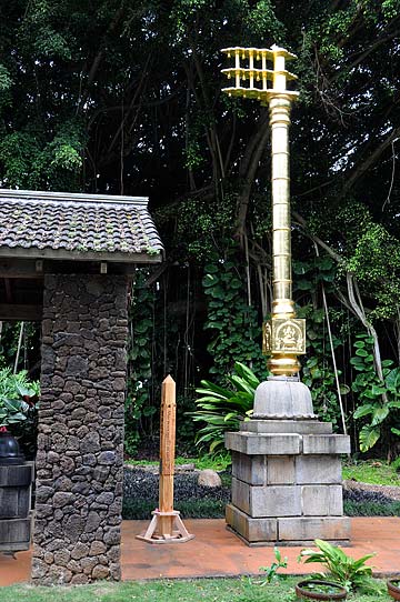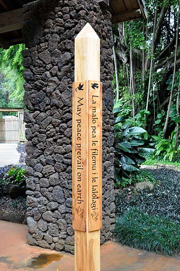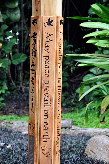 Underneath the Japanese there is a stainless steel plaque with Braille and a notice "Sponsored by the Interfaith Roundtable of Kauai" where the plan to create and put these poles into the community was born and nurtured.