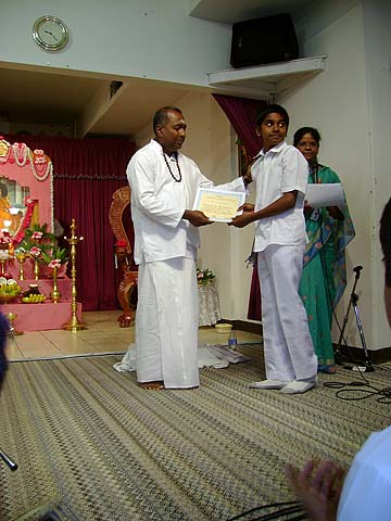 Twenty-five students from last year's summer camp take turns and visit the Yee Hong Center every first Saturday of the month to perform this service. In a special ceremony at the Sai Illam of Toronto, Rishi Thondunathan presented a "Certificate of Appreciation of Service" to the 25 youth who participated in this program.