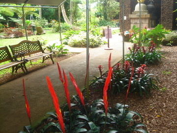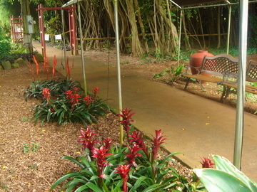 July 26, 2009Beautiful Hawaiian flowers brighten up the pathway leading to the Kadavul Temple. These Guzmanias were a gift from the owner of a giant nursery on the Big Island, wanting to share his abundance with the monastery. Thanks, David!