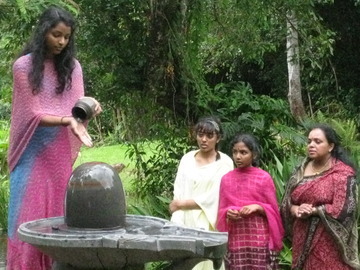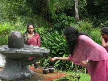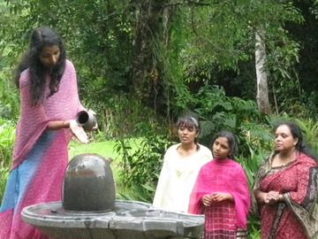 Mother and daughters, Aishaini, 18, Kalaiyashni, 16 and Umashni, 11 sing devotional songs as they perform abhishekam to the Narmada Lingam