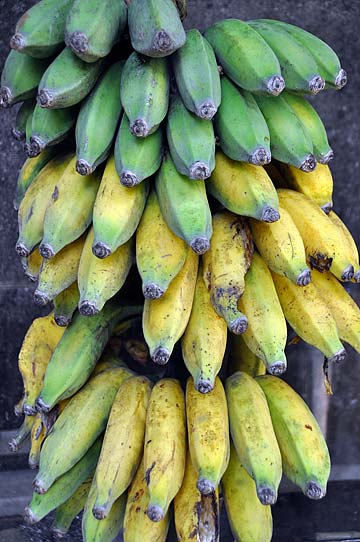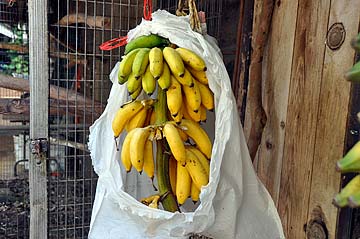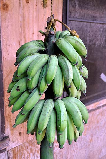 Stalks of bananas are brought in to ripen just outside the kitchen. They are hung on ropes from the roof eves.