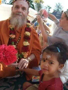 During the homa on the front steps of the temple little Lalitha was given her commencement of learning ceremony, vidyarambha, one of the sacraments of childhood. Lalitha is the daughter of two of Bodhinatha's Master Course students, Mayuran and Amanda Muttulingam.