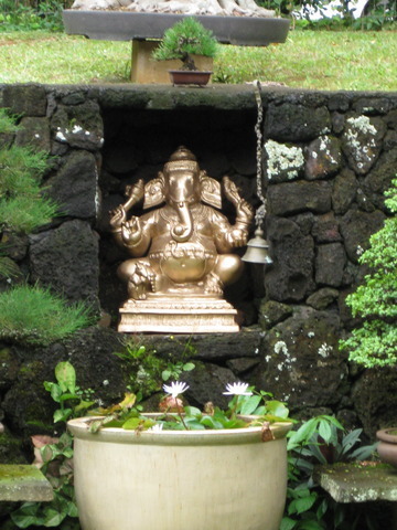 August 9, 2009Sunday, August 9th the Wailua Mission members and Master Course students living on Kauai gathered at the lovely home of Tandu and Uma Sivanathan. Here is one of the many beautiful Ganesha murthis in an alcove surrounded by water lilies and bonsai trees.