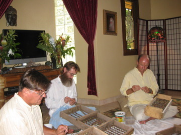 A surprise guest from California on pilgrimage for a week, Nathan Sendan assists with putting the rudraksha beads on the racks.