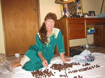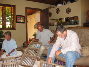 Our beautiful and ever energetic hostess, Uma Sivananathan sits on the floor sorting the rudraksha beads by size and color to make malas.