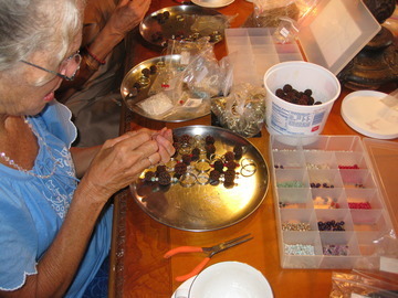 Kulamata Valli Sendan makes the many colorful tassels for the rudraksha malas as Rishimata "Oma" helps with the beads on a string