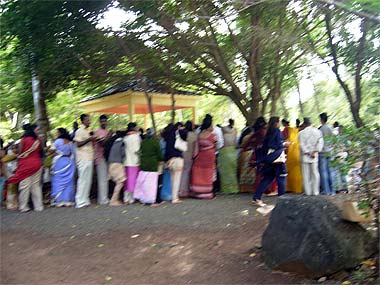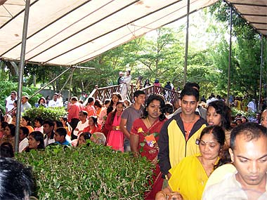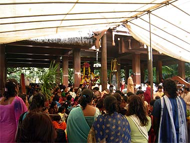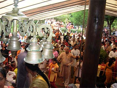 Devotees coming down from the Ganesha Bridge. which is the entrance to the main mandapam where pujas are held.