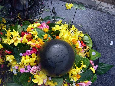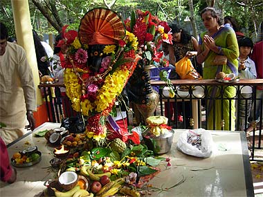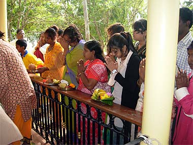 A little crowd gathers at the small Pancha Ganapati shrine.