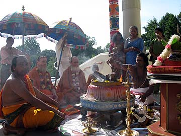 Satguru Bodhinatha Veylanswami and Shanmuganathaswami attending the Subramanya Homa.
