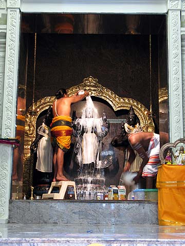 Abhishekam to main Murugan, Valli and Devasena murtis in the main sanctum of the Murugan Temple.