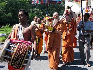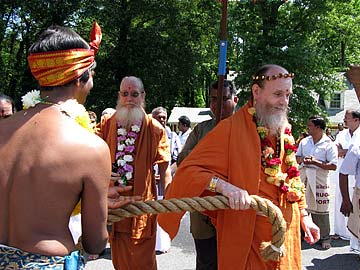 Satguru Bodhinatha Veylanswami is carrying the kumbam, while Shanmuganathaswami is carrying the kalasam (the top ornament of the Ratham). They are walking from the Temple to the Ratham site.