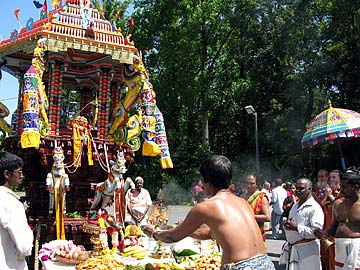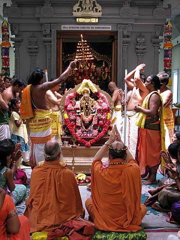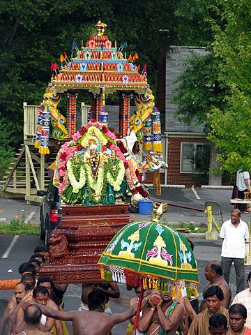 In the afternoon, after the Ratham procession around the Temple, Murugan, Valli and Devasena were re-decorated in green cloths and green garlands while they were still in the Ratham; then, carried by devotees on the lion-pedestal back to the Temple. This "changing into green cloths" is a well know tradition of the Nallur Temple in Jaffna, Sri Lanka. This Ratham was sponsored by Sri Lankan Tamil Murugan devotees from New York and New Jersey, and they made sure that every Nallur tradition has been strictly followed here as well, even brought green cloths for all the priests!