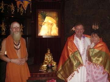 August 11, 2009Dasan and Shakti Mahadevan, devotees of Satguru Bodhinatha Veylanswami, are here celebrating their twenty-fifth wedding anniversary. They received a special archana during the morning puja in the Kadavul Temple where their marriage was blessed. Paramacharya Ceyonswami then presented them with a beautiful shawl. Congratulations Dasan and Shakti!
