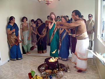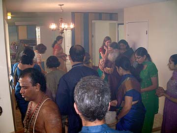Ananth Shastri chants after offering has been made to Agni. In the background are friends attending the home blessing.