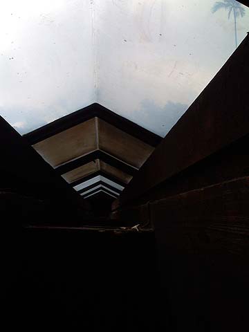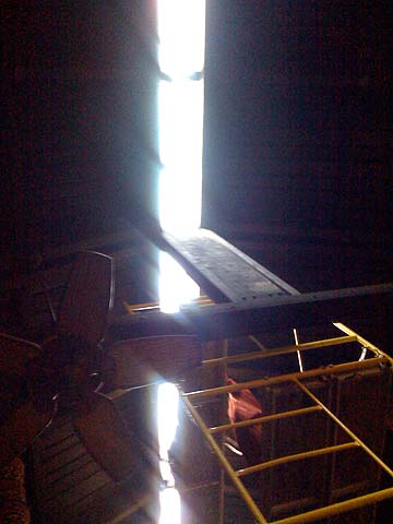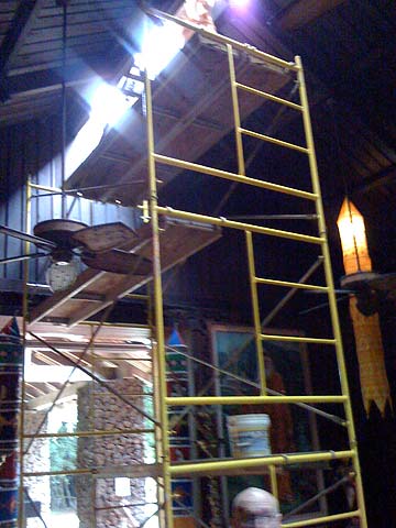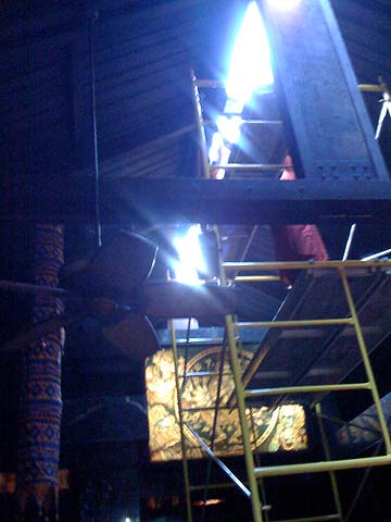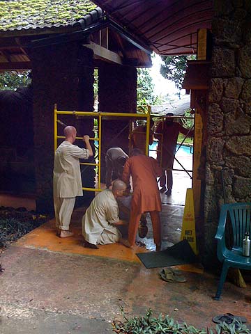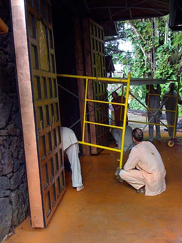 Kumarswami and Sivakatirswami aloft cleaning the soot off the plexiglass. The assembly of the scaffolding was the hard part, the cleaning went quickly.