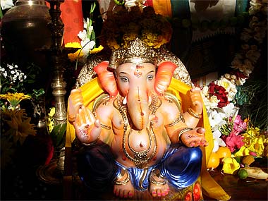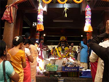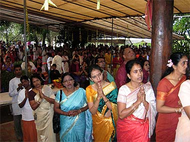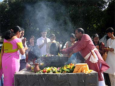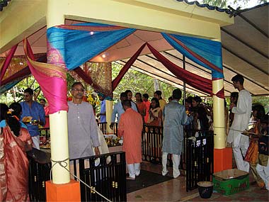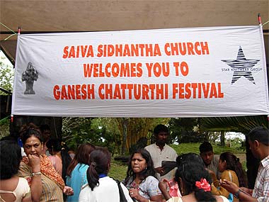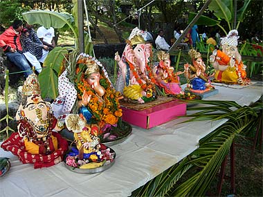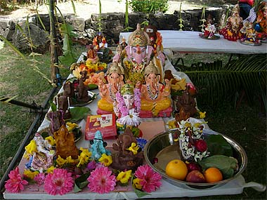 A hired Indian sivacharya officiated the ceremony early in the morning. Lord Ganapati is decked with hundreds of flowers and some devotees have lovingly woven from home a variety of garlands, made of marigold flowers, lime fruits and "dhurva" grass, sacred to Ganesha.