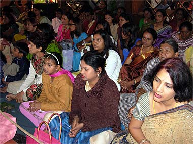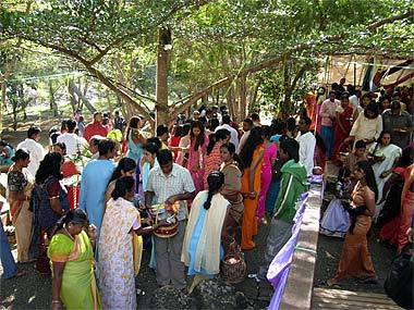 Devotees close by preparing their trays of offerings.