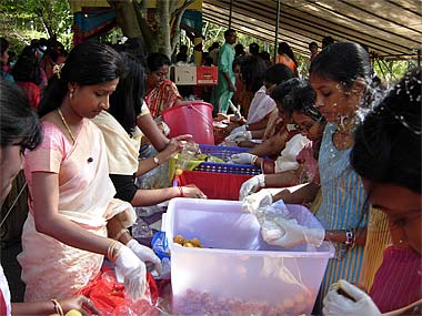 At another part off the Mandapam another group of sishyas are helping to fill bags of sweets to be later offered to devotees.