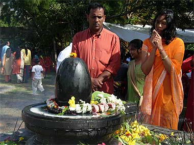 Worshipping at the Narmada lingam...