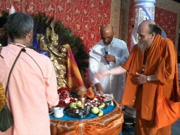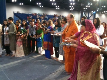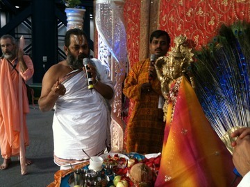 August 31, 2009On August 29, Satguru Bodhinatha Veylanswami attended as the chief guest the 20th Grand Annual Janmashtami Celebration organized by the Hindus of Greater Houston. After an excited and devotional parade, Bodhinatha was led up on the main stage to participate in an Agamic Vishnu puja.