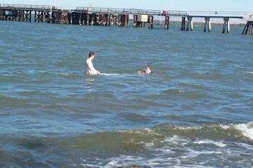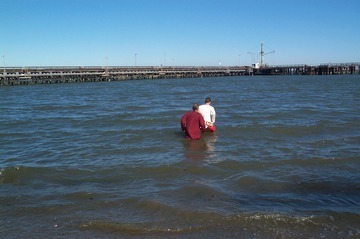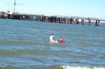 Hotranatha Ajaya and Jothi Param went in the water to immerse the Ganeshas.