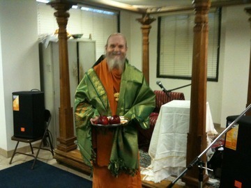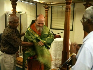 The temple board honored Bodhinatha with a shawl after his presentation. The talk was quite well received, and several people asked mature questions afterward.