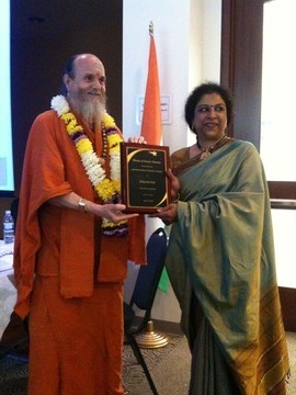 Bodhinatha then presented an award to Mrs. Kalyani Giri, a renowned journalist who has written for Hinduism Today a number of times and continues to do great work for Hinduism in her field. She was speechless! Congratulations, Kalyani.