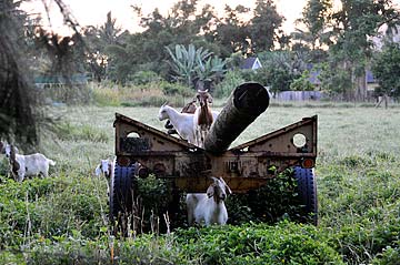 Our neighbors goats are playing on a log in the field.