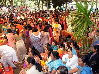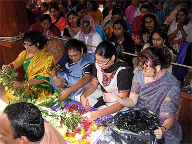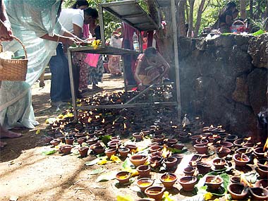 It is tradition for many devotees to bring a lighted clay lamp with their offerings. Hundreds of these small lamps are placed near the Pancha Mukha Ganapati shrine.