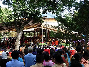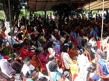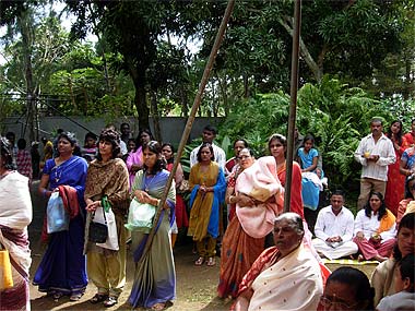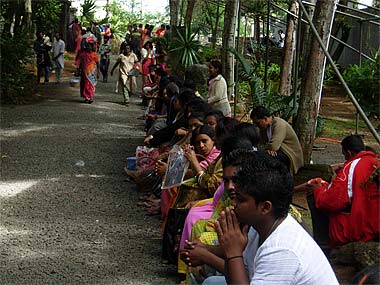 Devotees seated in the shade along the gravel path leading to the Mandapam...